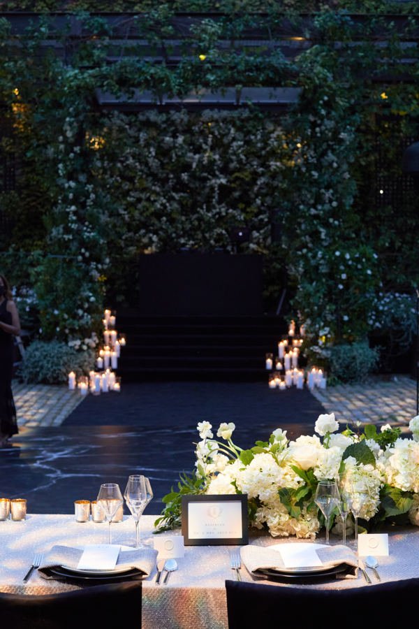 A timeless custom monogram was designed for Sana & Arun that was used first on the invitations and then repeated at their wedding on everything from bar signs to dinner menus. Invitations were blind embossed and letterpressed in black with a chic black painted edge. Favorite details included wax seal embellished place cards at each place setting and mini tented cards for butler passed signature cocktails.